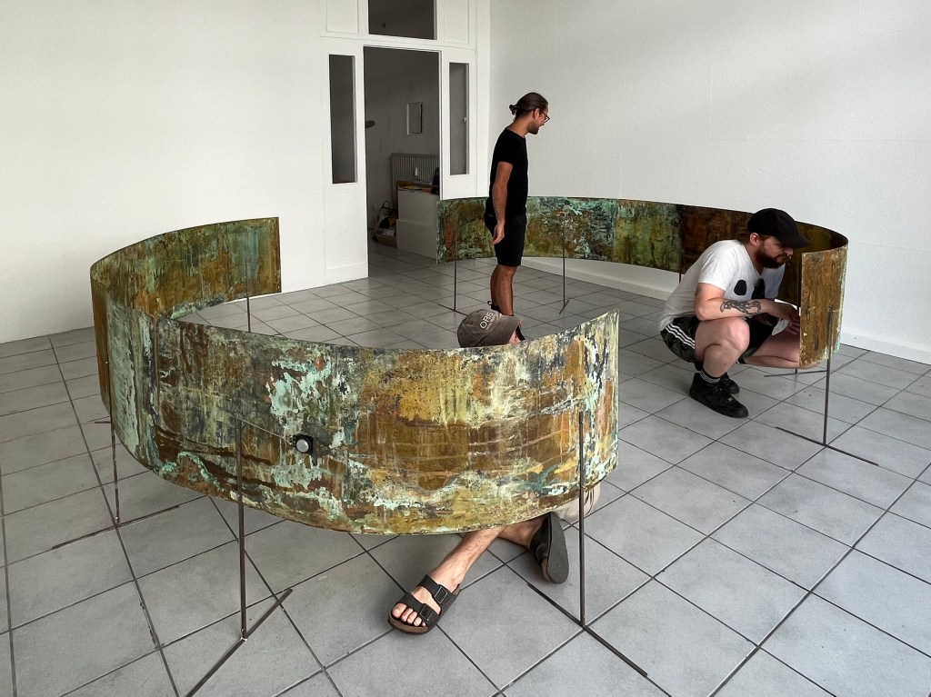 Sound Installation, 4 transducers, delay loop composition, Corroded Copper