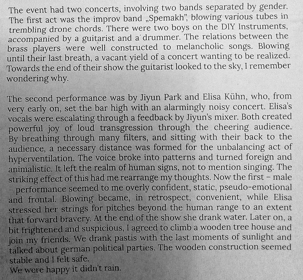 Control is a defining aspect in the work of Elisa Kühnl and Jiyun Park. Kühnl has designed her vocal practice to question the rules of normal use of the voice and thus to penetrate the spontaneous areas of sound and noise. The decision to deal with the weird and high- pitched moments of the voice is a controlled grip. Their interest is an interaction with function of a voice in human body and generating new relationship between space and performers by auditory perception.